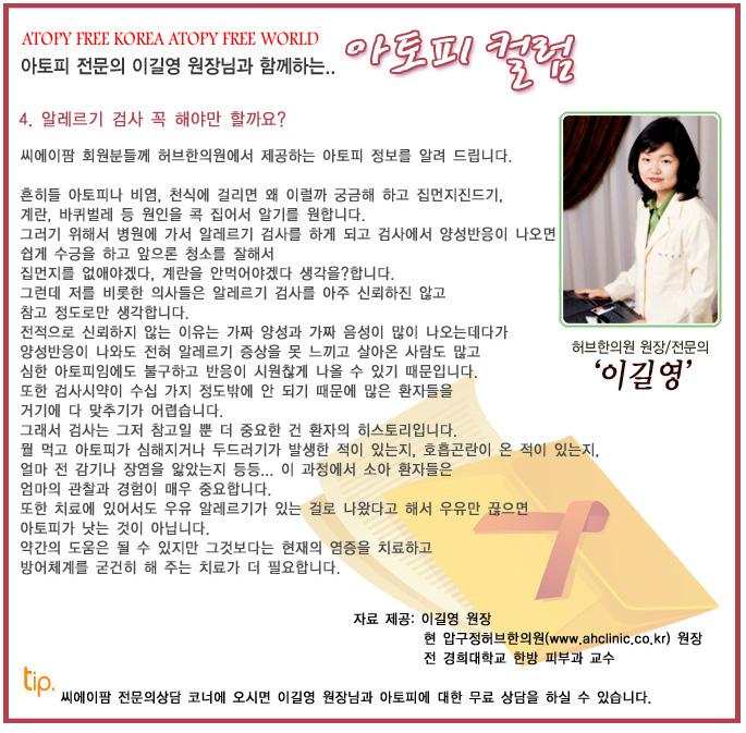 [씨에이팜 칼럼] 알레르기 검사 꼭 해야만 할까요? 페이지 정보 언론사 : 씨에이팜 조회수 : 3,600회 게재일 : 09-02-12 본문 목록 이전글[씨에이팜 칼럼] 영유아 아토피의 특징 09.02.14 다음글[씨에이팜 칼럼] 아토피 체질은 유전됩니다 09.02.12